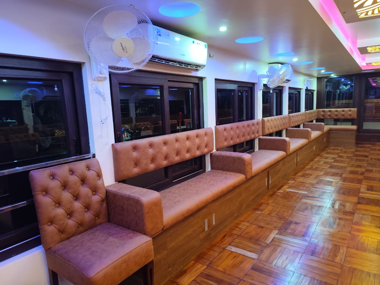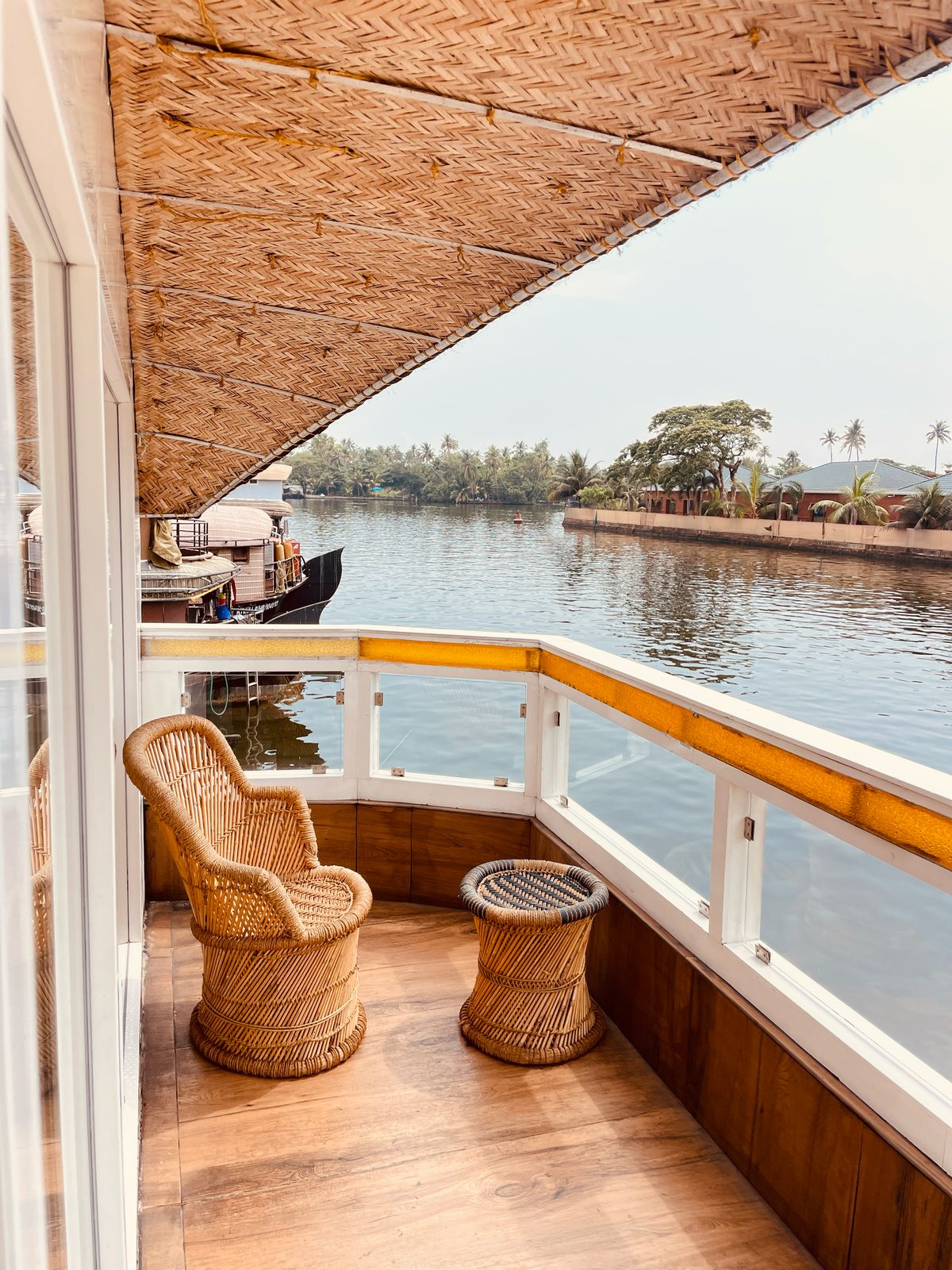 Each bedroom features full air-conditioning, attached bathrooms, and beautifully furnished interiors. The living area, dining space, and panoramic windows offer uninterrupted views of the calm backwaters, making your cruise scenic and relaxing throughout.